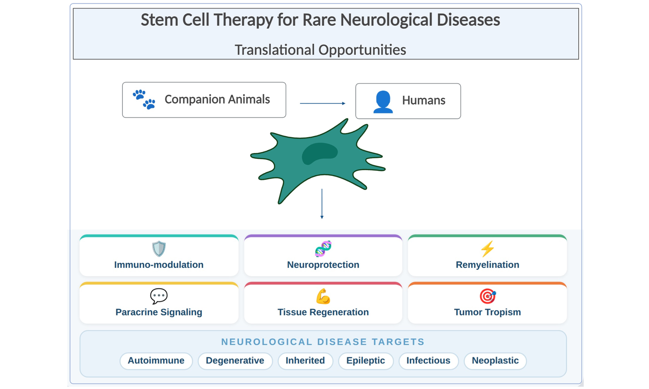 Stem cell therapy represents a transformative approach to treating neurological diseases. MSCs have shown potential to modulate inflammation, promote repair, and improve clinical outcomes across a range of conditions. Studies in dogs laid the groundwork for stem cell therapy in human conditions, and spontaneous animal models offer valuable platforms for testing and refining MSC therapies to accelerate translational research. Naturally occurring diseases in companion animals provide real-world insights into disease progression, therapeutic response, and patient variability. These models can inform human trial design, biomarker development, and endpoint selection. By aligning human and veterinary research, we can accelerate the development of effective treatments for rare, complex, and challenging neurological diseases across species.