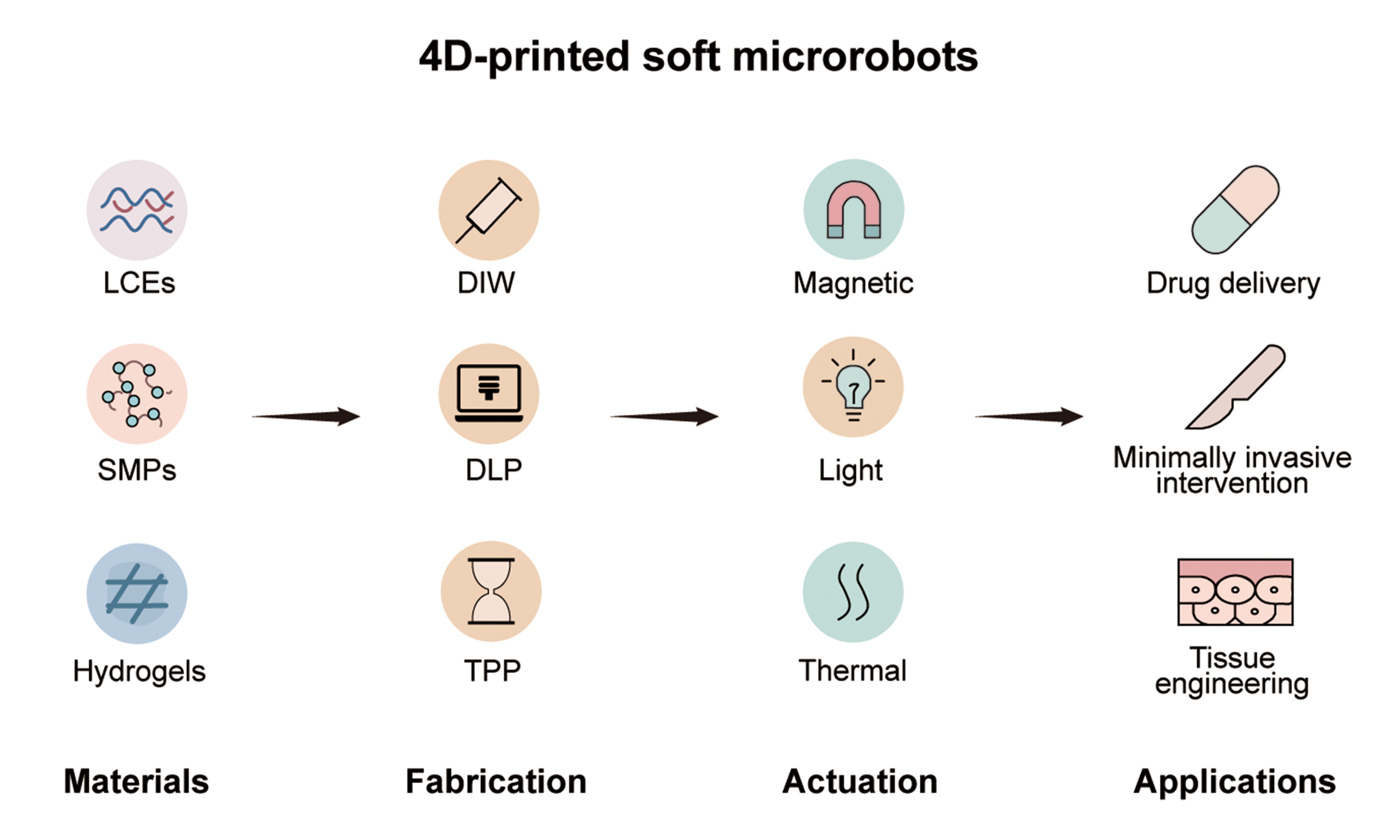 Three-dimensional (3D) printing, also known as additive manufacturing (AM), is a versatile, digitally guided, layer-by-layer process for directly fabricating complex 3D geometries, a paradigm first introduced in 1986 by Chuck Hull[1]. It has become a crucial method from model to device for microrobots, enabling rapid iteration, integration of different materials, and sub-millimeter-scale feature control[2-6]. However, traditional 3D-printed structures are typically geometrically fixed after curing, meaning in-situ reconfiguration, autonomous deformation, and closed-loop behavior often require additional components or external mechanisms. These limitations have spurred a shift toward temporally programmable materials[7-12]. Four-dimensional (4D) printing extends 3D printing by encoding materials with anisotropic responses and functional gradients to stimuli, enabling printed structures to predictably alter their shape, properties, or functionality. As a cutting-edge technology, 4D printing accelerates the construction of microstructures and smart functional devices for diverse applications, including targeted drug delivery[13], tissue engineering[14], stents[15], and sensing[16].
