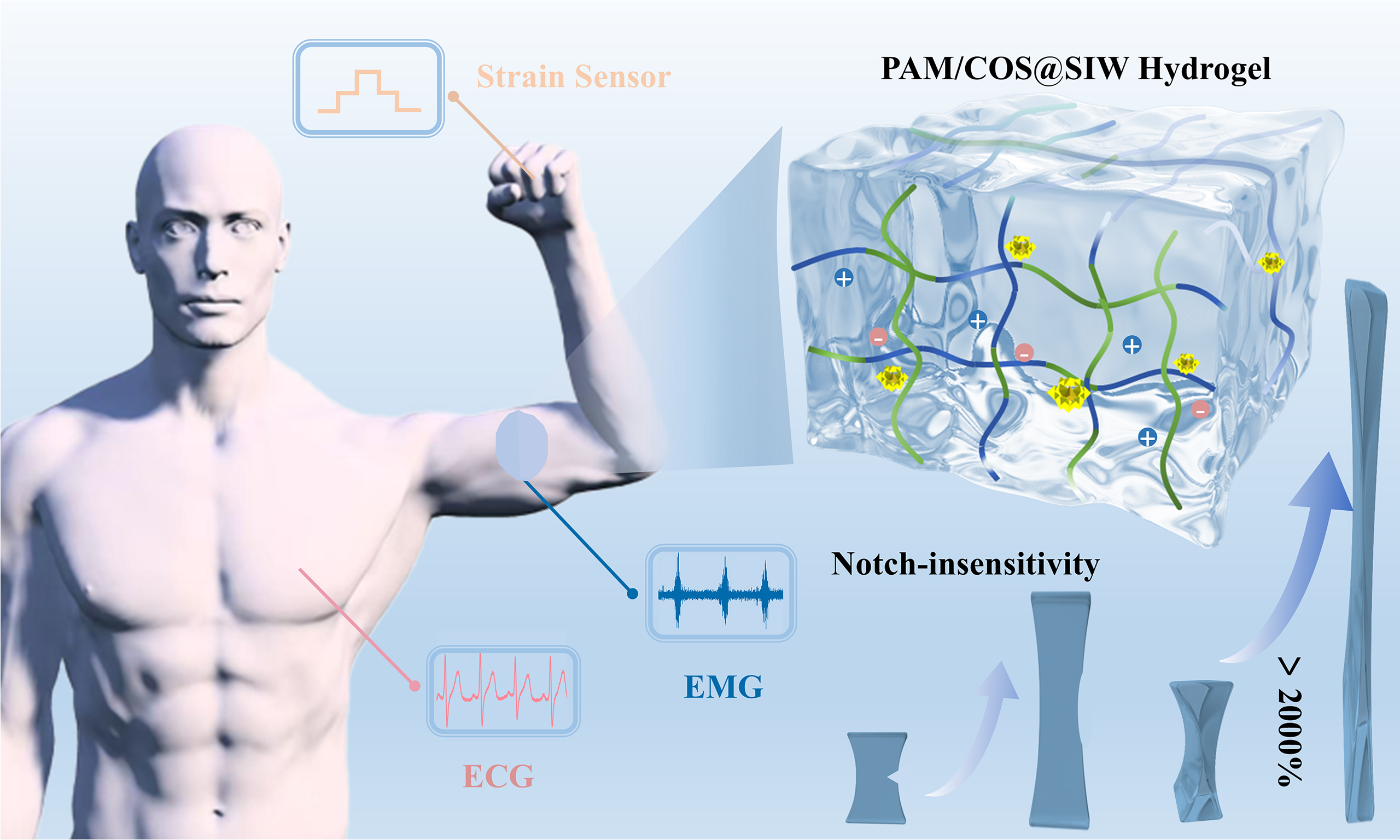 Technological advances in healthcare and the rise of personalized health management have highlighted the importance of real-time monitoring of human motion[1-3] and physiological signals in chronic disease diagnosis and health assessment[4,5]. Flexible and wearable sensors capable of converting external stimuli, such as strain and stress, into electrical signals have been extensively developed to meet these needs[6,7]. In practical applications, there flexible sensors usually from large deformation and thus are susceptible to crack propagation, which in turn drives the demand for advanced sensing materials[8,9]. Hydrogels, composed of three-dimensional polymer networks and water, have emerged as promising candidates for flexible sensors owing to their excellent biocompatibility, tissue-like softness, and structural tunability[10,11]. However, conventional hydrogels are typically electrically insulating and mechanically weak, which significantly limits their further application in flexible sensing technologies[12].