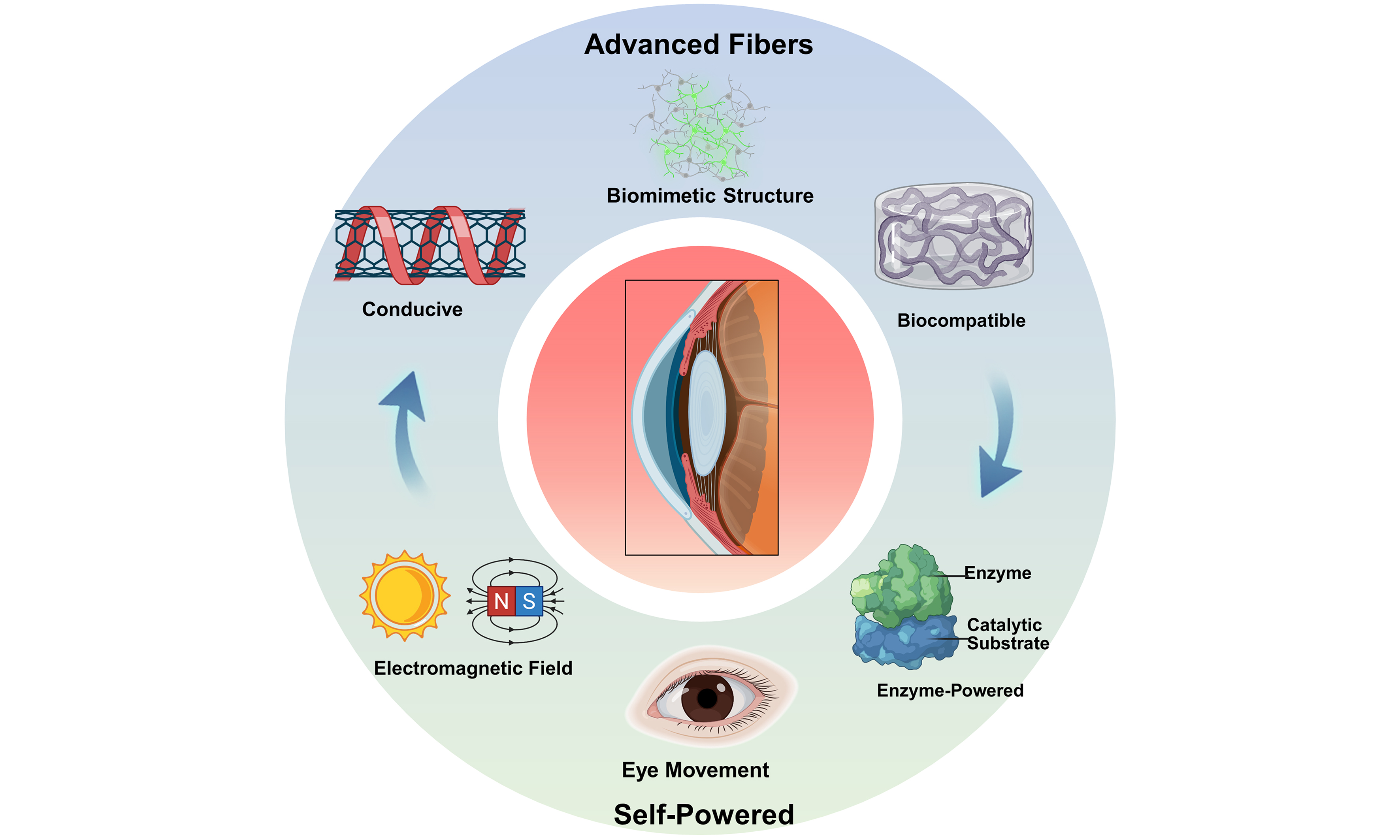 The in-depth integration of the Internet of Things (IoT), artificial intelligence (AI), and biomedical engineering is transforming flexible wearable devices from simple peripheral accessories into new functional platforms that can easily integrate with the human body to achieve continuous health monitoring[1] and accurate medical intervention[2-5]. The next generation of biomedical electronics faces major challenges in ophthalmology, and there is an urgent need to develop new diagnostic and therapeutic platforms that are minimally invasive and can function in the body for extended periods[6]. The mechanical property mismatch between traditional ophthalmic devices and ocular tissues not only affects patient comfort but also compromises the continuity of monitoring data[7]. Besides, the limited energy supply restricts device functionality, lifetime, and clinical applicability.