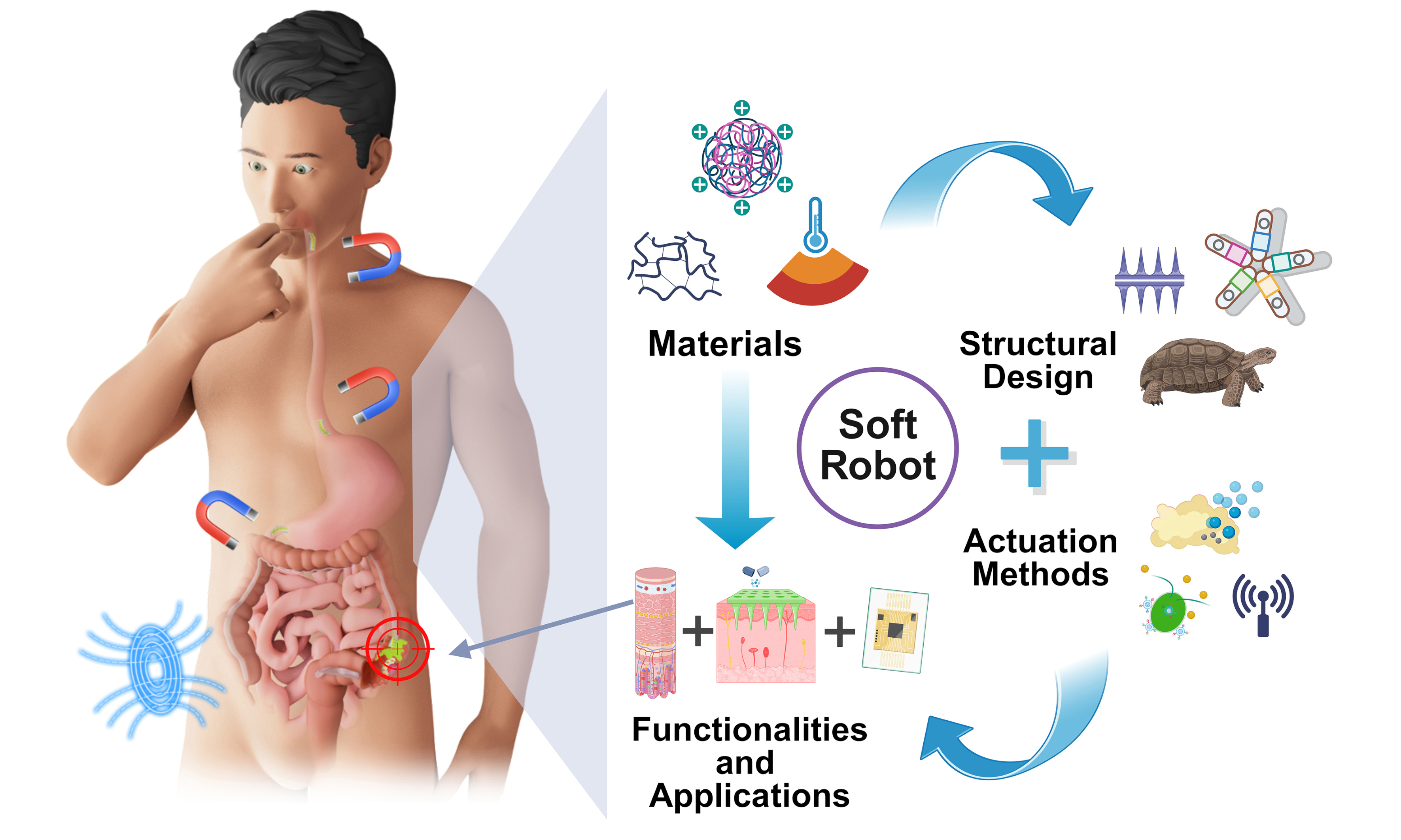 This review aims to systematically delineate the latest advances in GI soft robotics field by integrating insights across four key dimensions: materials science, structural engineering, actuation strategies, and functional implementations [Figure 1]. A function-oriented material classification system is proposed, encompassing three major categories: biocompatible soft elastomers, smart responsive materials, and functionalized conductive and magnetic materials. Subsequently, three structural design strategies (namely continuous-encapsulated, modular-reconfigurable, and biomimetic morphologies) are summarized. Furthermore, the diverse actuation mechanisms, including field-driven, fluid-driven, and chemical reaction-driven methods, are systematically analyzed with respect to their applicability and technical characteristics. Finally, the multifunctional applications are thoroughly elaborated, ranging from fundamental drug delivery to complex integrated diagnosis and therapy. Through this review, we aspire to guide theoretical and technological advances in soft robotics, and aim to accelerate the clinical translation of GI soft robotic technologies from laboratory to clinics.