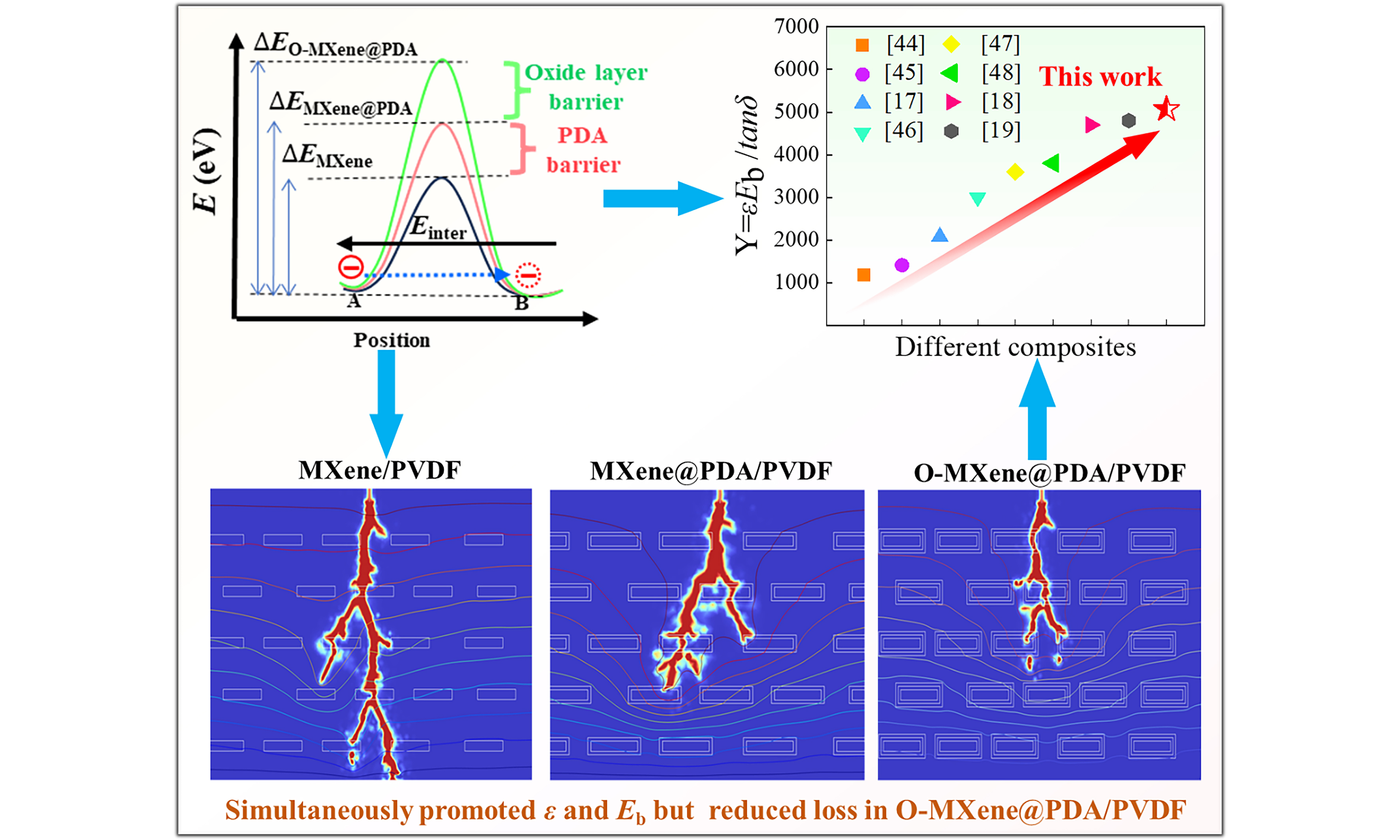 The MXene@PDA nanofillers exhibit a significant suppression effect on the tanδ in PVDF-based nanocomposites at the same filler loading compared to the unmodified MXene or PDA encapsulated MXene/PVDF systems. After introducing the first oxide interlayer in the MXene@PDA/PVDF, the resulting O-MXene@PDA/PVDF nanocomposites exhibit notably higher ε along with substantially lower tanδ and conductivity. The double shells are capable of capturing a greater number of charge carriers, realizing the decoupling and independent control of rapid intra-particle polarizations at high frequency and slower inter-particle polarizations at low frequency, leading to a remarkable enhancement in ε. Furthermore, the highly insulating oxide and PDA layers generate numerous charge-trapping sites across the interfaces, effectively impeding long-range charge carrier migration. Meanwhile, the O-MXene@PDA/PVDF nanocomposites also demonstrate an increased Eb due to the following reasons: (1) the oxide layer is crucial for modulating the energy level structure in the interface region, resulting in a greater number of deep traps in the nanocomposites when compared to a single PDA shell, so this further restricts space charge migration and accumulation, leading to evidently enhanced Eb; (2) Finite element and electric treeing simulations indicate that introducing the core@double-shell O-MXene@PDA notably reduces the dielectric mismatch between the filler and the PVDF. This alteration extends the breakdown pathway in the nanocomposite, progressively enhancing the Eb. This study offers a viable strategy for the synergistic regulation of both intraparticle and interparticle polarizations, enabling simultaneous improvements in ε and Eb while minimizing losses in polymer composites. This approach showcases potential applications for advancing future microelectronic devices and power systems.