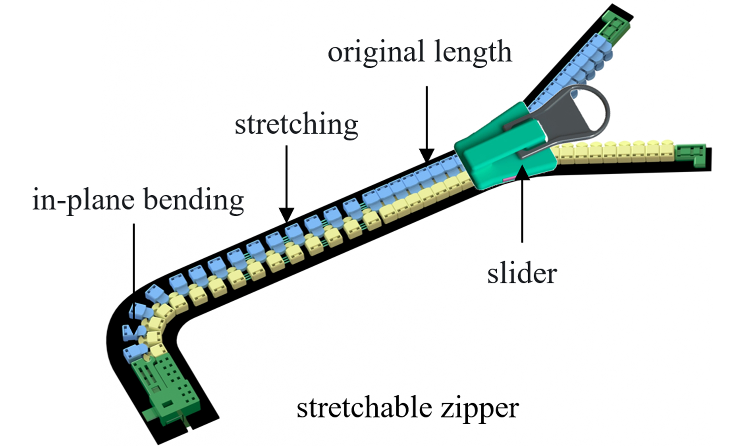 Zippers, which are generally not stretchable, are composed of teeth, a slider, top and bottom stops, and two non-stretchable nylon tapes. As the slider moves along the tapes in the zipping direction, its internal structure presses the teeth laterally, inserting the tooth protrusions on one side into the grooves on the other side to interlock and bring the two tapes together. Whether the teeth are spoon-, spiral-, or arch-shaped, maintaining the compact arrangement of teeth along the length direction is the fundamental requirement for achieving zipper interlocking. Simply replacing non-stretchable nylon tapes with stretchable tapes inevitably increases the distance between teeth during stretching and consequently leads to their separation. The conflict between the need for compact tooth arrangement in traditional zippers and the demand for stretchability in stretchable zippers is the crucial challenge in structural design.