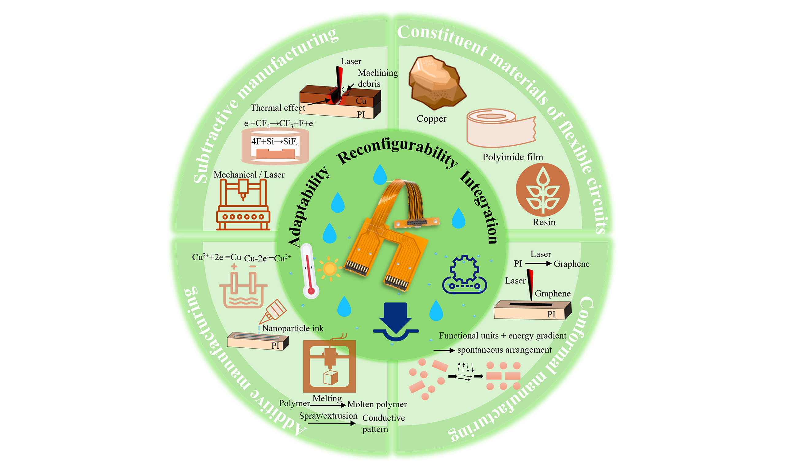 Flexible circuits, constructed upon pliable substrates, have evolved into high-performance electronic systems that demonstrate superior adaptability and engineering advantages across diverse application domains, far surpassing their rigid counterparts in versatility and integration[1,2]. In biomedical engineering, their inherent biocompatibility and mechanical flexibility have enabled widespread integration into implantable medical devices such as cardiac pacemakers and cochlear implants[3,4]. In aerospace applications, where systems must endure elevated temperatures and mechanical stress, flexible circuits have proven indispensable in cockpit display modules and satellite communication antennas, owing to their thermal resilience and systemic reliability[5]. Their lightweight structure and high integration density have also positioned them as foundational elements in wearable technologies, powering devices such as smartwatches and virtual reality (VR) headsets with enhanced form factors and functional sophistication[6,7]. Furthermore, their long-term operational stability and extended cycling lifespan have facilitated their adoption in automotive electronics and industrial control systems[8,9]. Despite significant progress, the deployment of flexible circuits in complex environments - marked by high temperature, humidity, mechanical load, and deformation - poses escalating demands on structural integrity and operational reliability. As applications extend beyond wearables to multifunctional systems under multi-stress conditions, developing fabrication strategies that concurrently ensure flexibility, integration, and robustness is essential for stable performance and future breakthroughs.