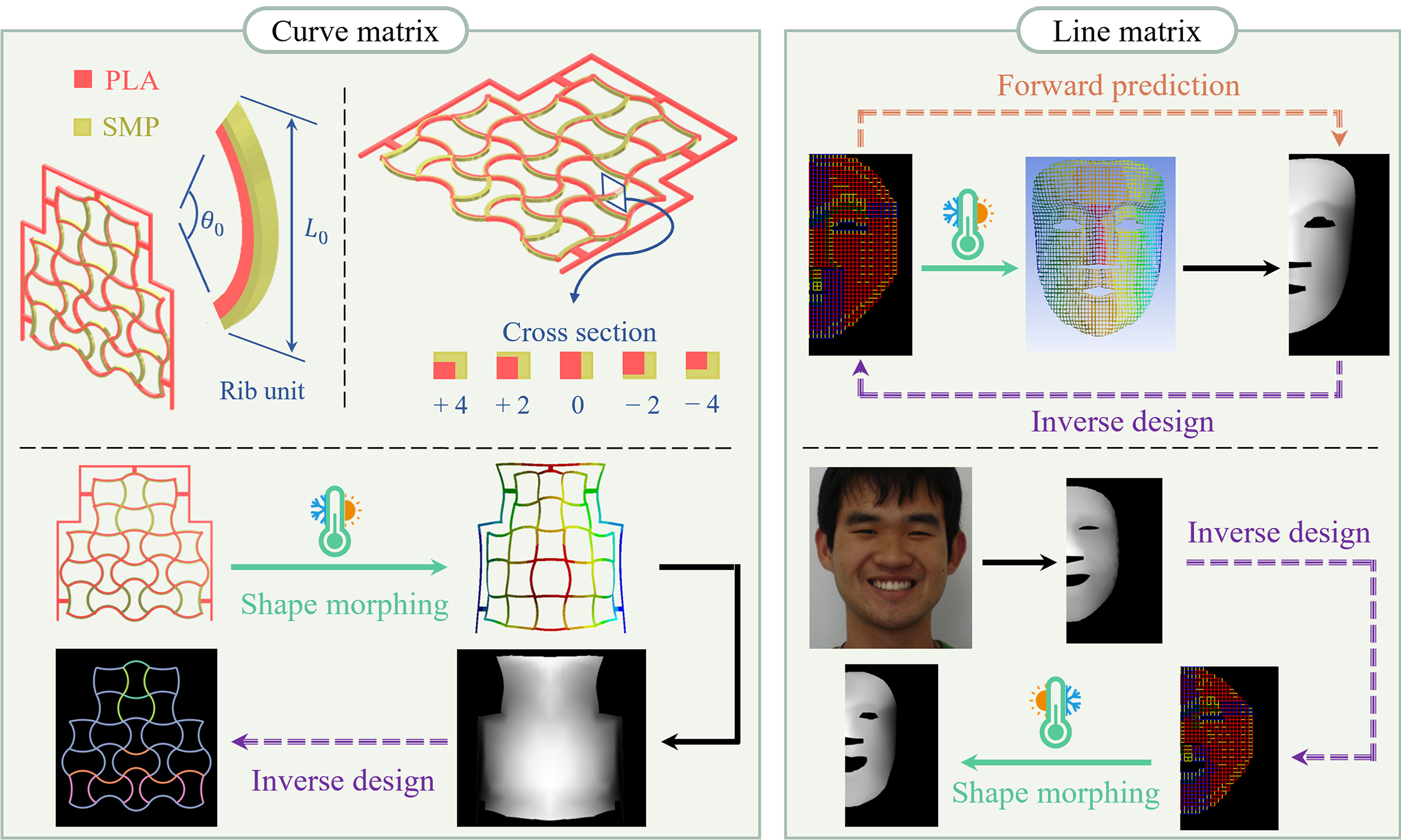 Facial masks have become a focal point of research due to their complex geometric features and high degree of personalization. Noses, eyes, mouths, and facial contours at various scales have unique curvatures and concavities, requiring more complicated and precise inverse design methods to implement 4D printing technology effectively[44]. Boley et al. utilized machine learning combined with conformal mapping to compute the lattice design required for a single Gaussian human face[20]. Nojoomi et al. used conformal mapping with a cone singularity to compute the growth function, and then applied digital light optical 4D printing to fabricate the design corresponding to a 3D face scan[34]. Ahn et al. employed mathematical functions and strain distribution to determine the 4D printing parameters necessary for a Korean facial mask[35]. However, the multi-step inverse design process required for a single facial target shape remains a significant challenge in manufacturing applications. We present the curve matrix, designed to emulate the geometric characteristics of the nose, which enables greater deformation with less material compared with the previously adopted line matrix[45]. Moreover, a fully convolutional network (FCN) is employed, utilizing multi-task learning on the curve matrix and transfer learning on the line matrix, to effectively address the inverse design of human facial features with complex global and local curvatures. The FCN also carries out a forward prediction task to estimate the 3D structure following deformation. Integrating FEA of shape morphing with deep learning for 3D feature extraction allows for the fabrication of customized complex geometries, significantly reducing manufacturing costs and simplifying the inverse design process.