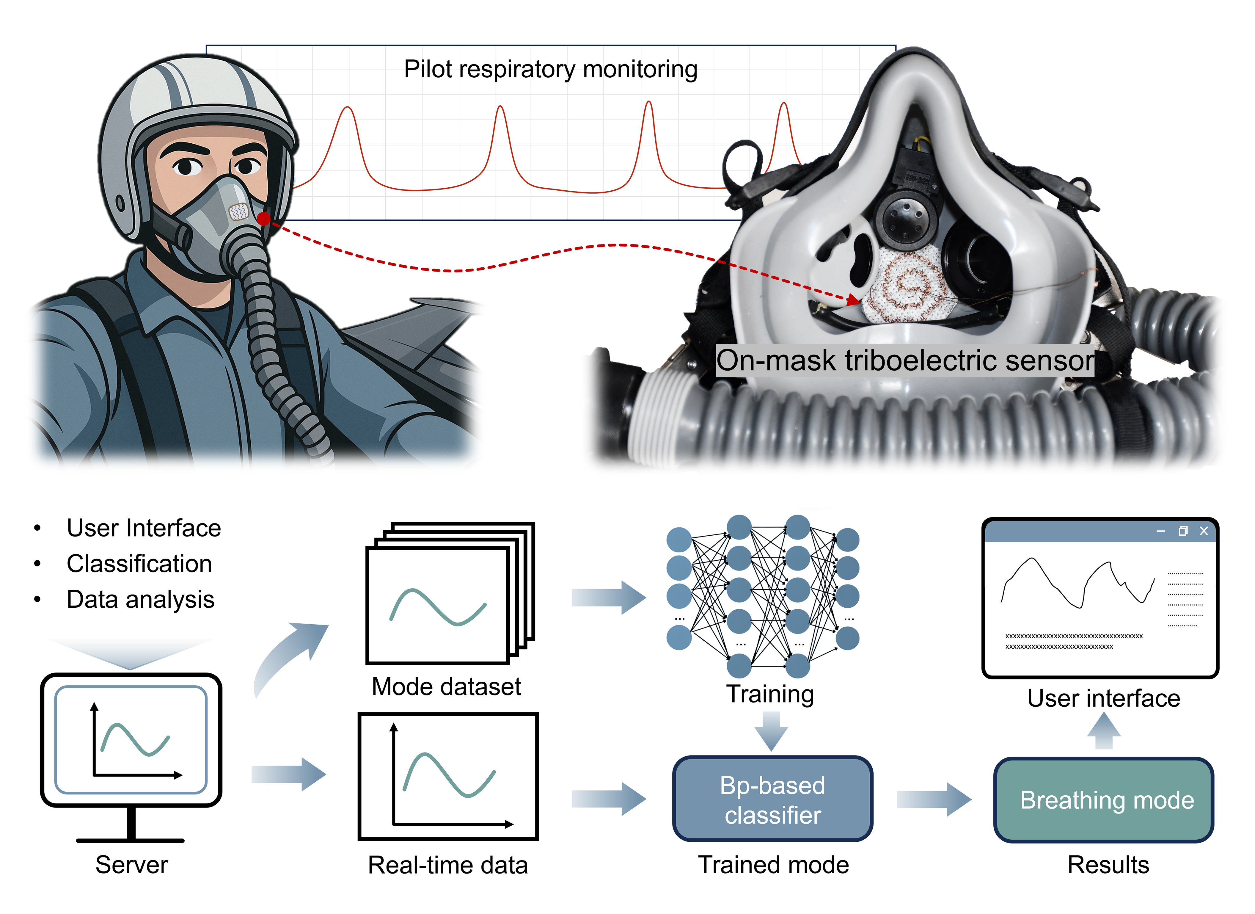 Respiratory rhythm serves as a critical physiological barometer for homeostatic regulation to internal and external perturbations[1,2]. In extreme settings such as high altitude, deep sea, and industrial environments, variations in ambient pressure, gas composition, or individual physiological constraints induce significant fluctuations in breathing rate, ventilation volume, and rhythm, which in severe cases may affect life safety[3]. Real-time monitoring coupled with external oxygen supplementation is therefore essential to maintain vital signs such as arterial oxygen saturation. Fighter pilots represent the most stringent example of this requirement during maneuvers, generating extremely high G-forces[4]. Oxygen delivery must precisely match instantaneous metabolic demand to prevent gravity-induced loss of consciousness from insufficient oxygen partial pressure or pulmonary and central nervous system toxicity arising from over-oxygenation[5]. Thus, it is imperative to develop a highly sensitive sensor system capable of capturing and identifying respiratory dynamics in real-time, while issuing early warnings upon detection of abnormal patterns[6-8].