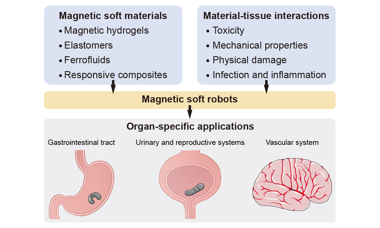To ensure a comprehensive and unbiased synthesis of the field, we conducted a structured literature search across Web of Science, Scopus, and PubMed. The primary keywords used included “magnetic soft robot”, “magnetic soft materials”, “ferrofluid robot”, and “biomedical soft robot”. The results were filtered to include proceedings, articles, and review articles. We focused on peer-reviewed articles published within the past ten years, prioritizing studies that reported advances in material development, magnetic actuation strategies, organ-specific design principles, or biomedical applications in vivo or in clinically relevant models. Existing reviews focus on the actuation mechanisms and functionalization strategies[79,80] of the materials and soft components used in magnetic robots or the design, fabrication strategies, and biomedical applications of magnetic soft robots[9,81,82]. Since they lack an organ-centric perspective and clinical translation of magnetic soft robots depends on their capability to adapt to organ-specific challenges such as dynamic luminal contractions, variable biochemical milieus, and highly heterogeneous tissue-robot interface, this review discusses organ-specific materials and structural designs of magnetic soft robots [Figure 1]. We systematically discuss the development and biosafety of magnetic soft materials, focusing on four categories: magnetic hydrogels, silicone-based magnetic elastomers, ferrofluids, and magnetically responsive active composites. We analyze the chemical composition, mechanical properties, degradation behavior, and biocompatibility for in vivo implementations (Section MATERIAL DESIGN AND SAFETY ANALYSIS OF MAGNETIC SOFT ROBOTS). We also present a detailed assessment of organ-specific applications of small-scale magnetic soft robots in GI, urogenital, and vascular systems (Section ORGAN-SPECIFIC MATERIALS AND STRUCTURAL DESIGNS). We conclude the review by discussing the key challenges of the next-generation magnetic soft materials and robots for clinical translation, including the biofunctional material design, intelligent closed-loop control strategies, and multifunctional platform integration.